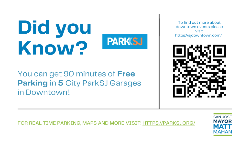 Check out ParkSJ.org to find your spot. Remember, parking is free for the first 90 minutes in these 5 City-owned garages: